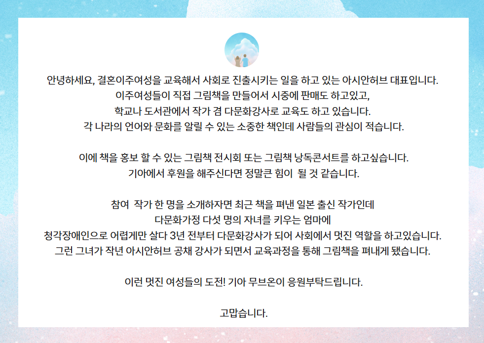 결혼이주여성을 교육해서 사회로 진출시키는 일을 하고 있는 아시안허브는 이주여성들이 직접 만든 그림책에 대한 홍보와 북콘서트를 하고싶다고 무브온에 사연을 보내오셨습니다.